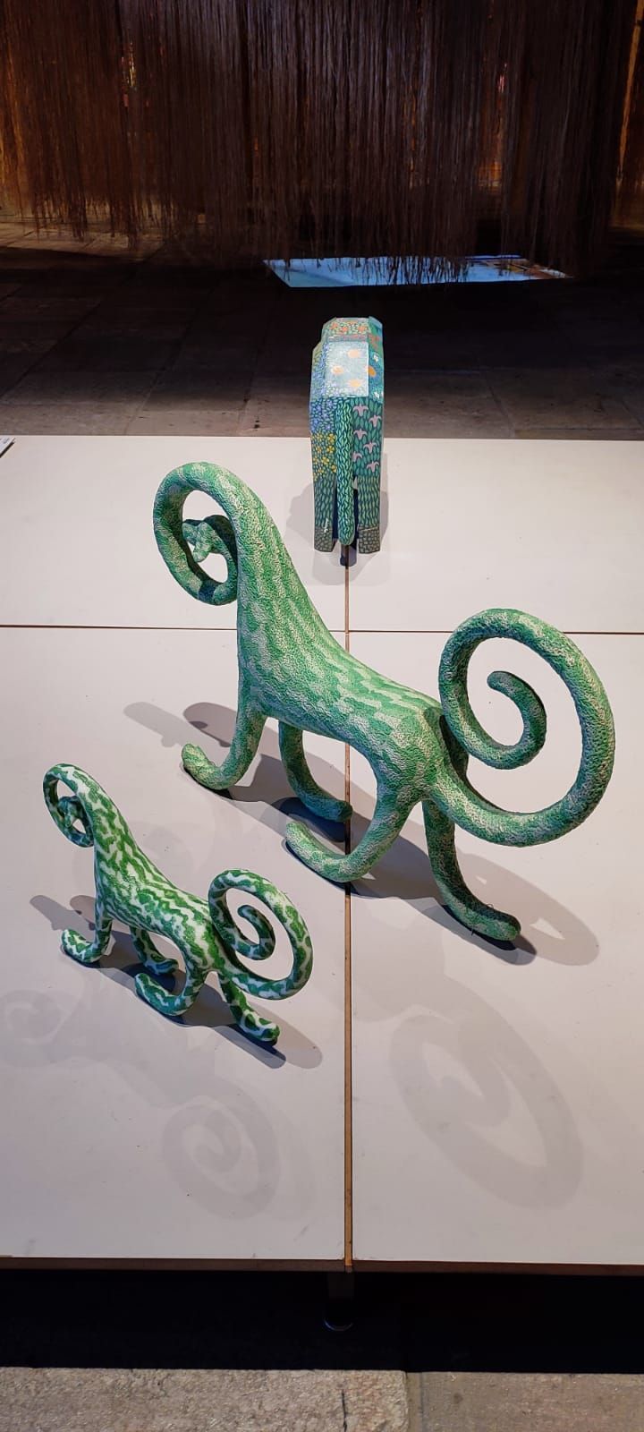As peças possuem diferentes relevos e texturas, valorizando a percepção tátil. O que nos impressiona pelas cores e formas, a eles se dá por meio da materialidade.